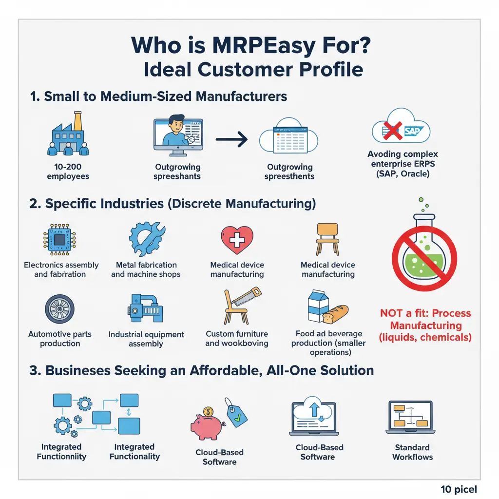 For small manufacturers operating with 10-200 employees, standard production workflows, and limited IT resources, MRPEasy represents a practical choice. The affordability, reasonable learning curve, and integrated feature set address the most common pain points these companies face.